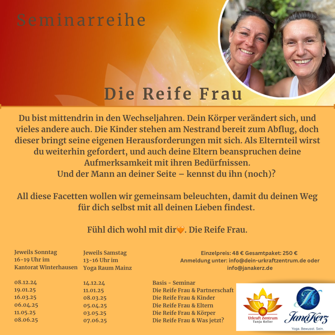 In der Lebensmitte steht die reife Frau an einem Wendepunkt, an dem sich viele Lebensbereiche gleichzeitig verändern: Der Körper wandelt sich, die Eltern benötigen zunehmend Unterstützung, Freundschaften entwickeln sich weiter, und je nach Lebenssituation können Partnerschaft oder das Alleinsein neue Fragen aufwerfen. Frauen mit Kindern erleben in dieser Phase, dass die Kinder beginnen, eigene Wege zu gehen; Frauen ohne Kinder richten den Blick vielleicht mehr auf Freundschaften oder andere Bindungen, die ihnen besonders wichtig sind. Diese Phase ist geprägt von Abschied, Neuanfang und dem Wunsch, sich selbst inmitten dieser Übergänge nicht zu verlieren, sondern neu zu entdecken.